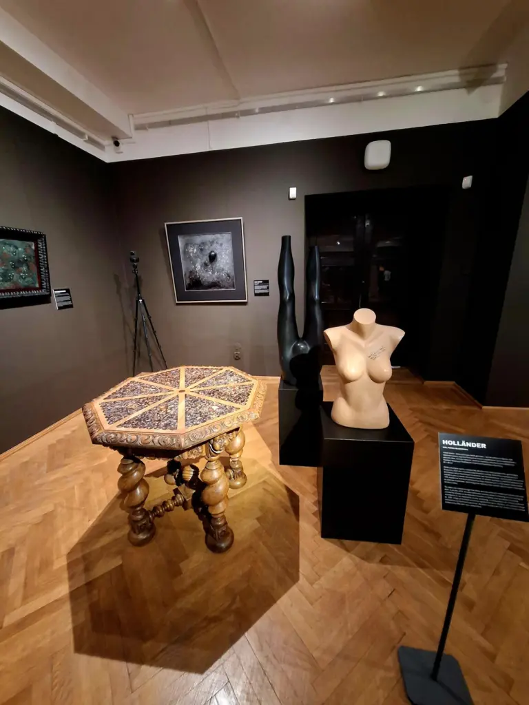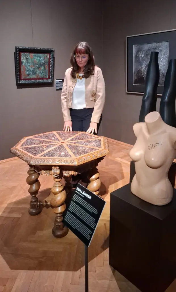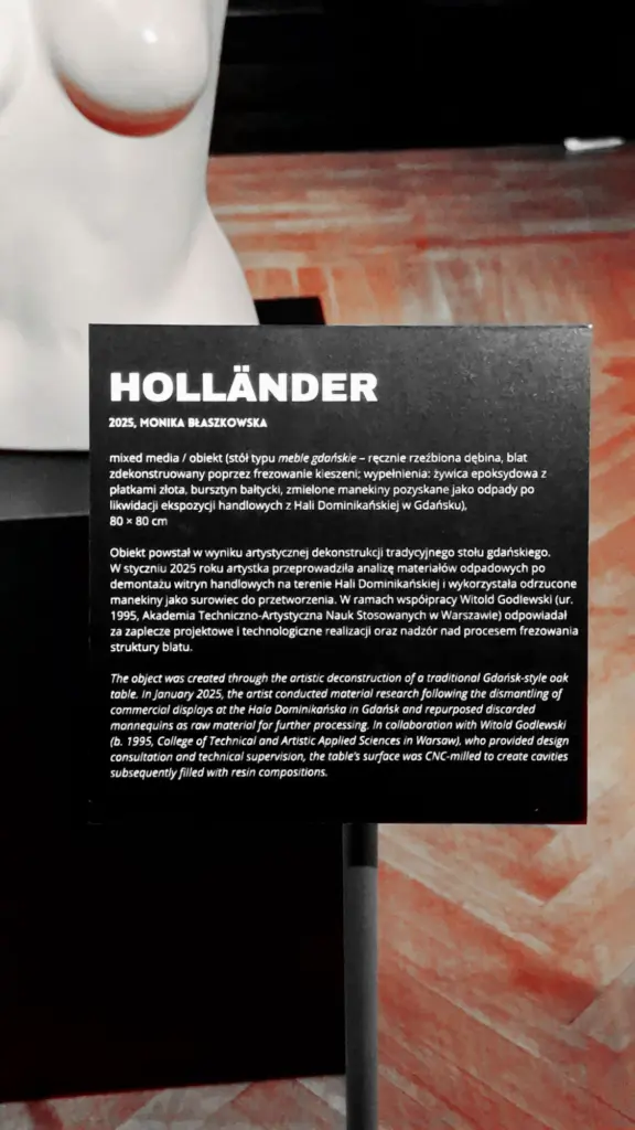 Na szczególną uwagę zasługuje stary, rzeźbiony stół, jedna z najnowszych projektów artystki, którego blat wykonano ze zmielonych plastikowych manekinów.  Zachwyca on zarówno odwagą materiałową, jak i elegancją formy – inkrustacja z materiału recyklingowego przybiera tu niemal jubilerski charakter. Każda kolejna now praca wzbogacająca wystawę, stała się kolejnym przystankiem, zmuszającym odbiorcę do uważnego spojrzenia i odczytania wielowarstwowej narracji.