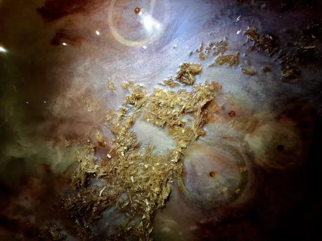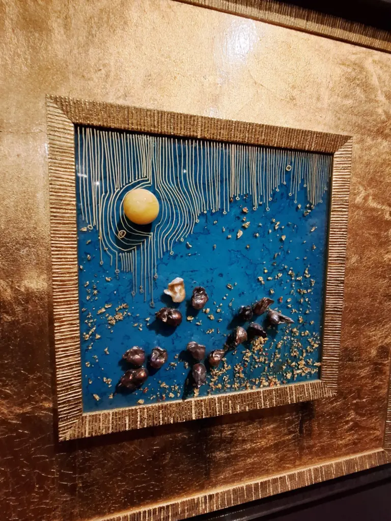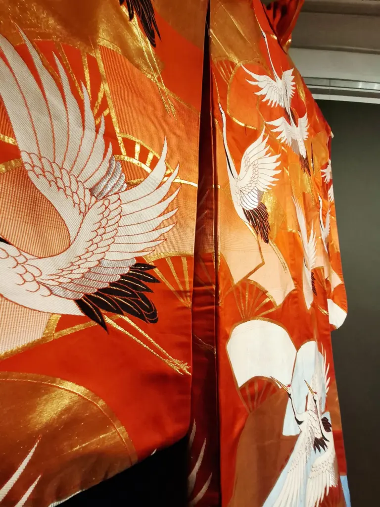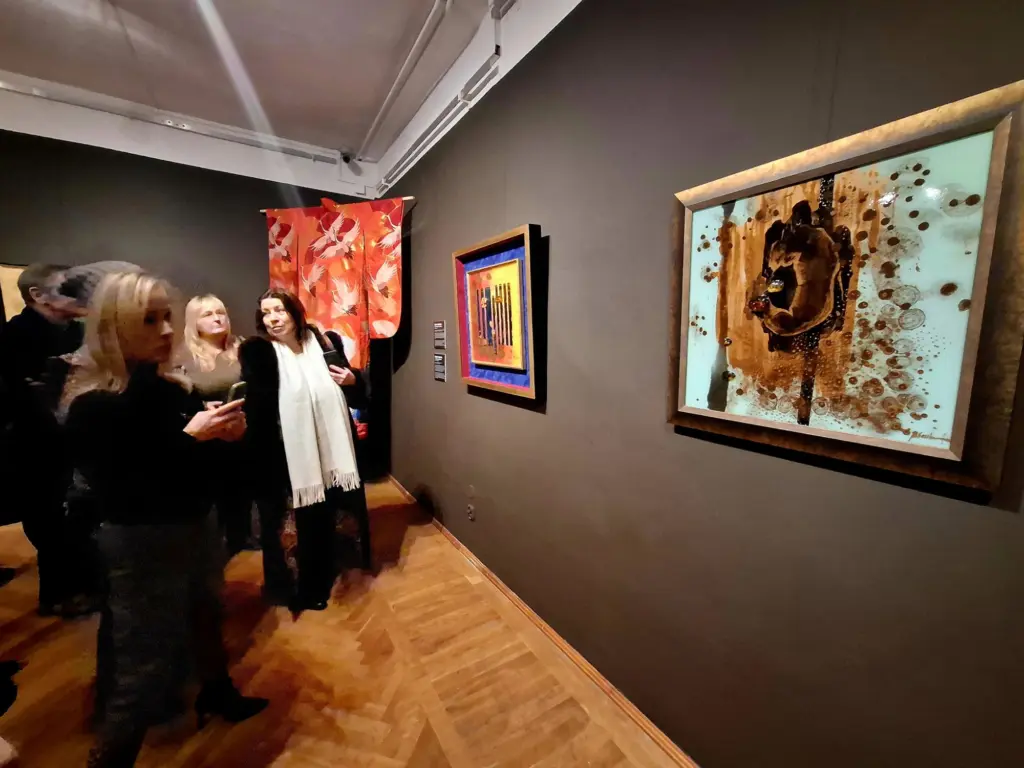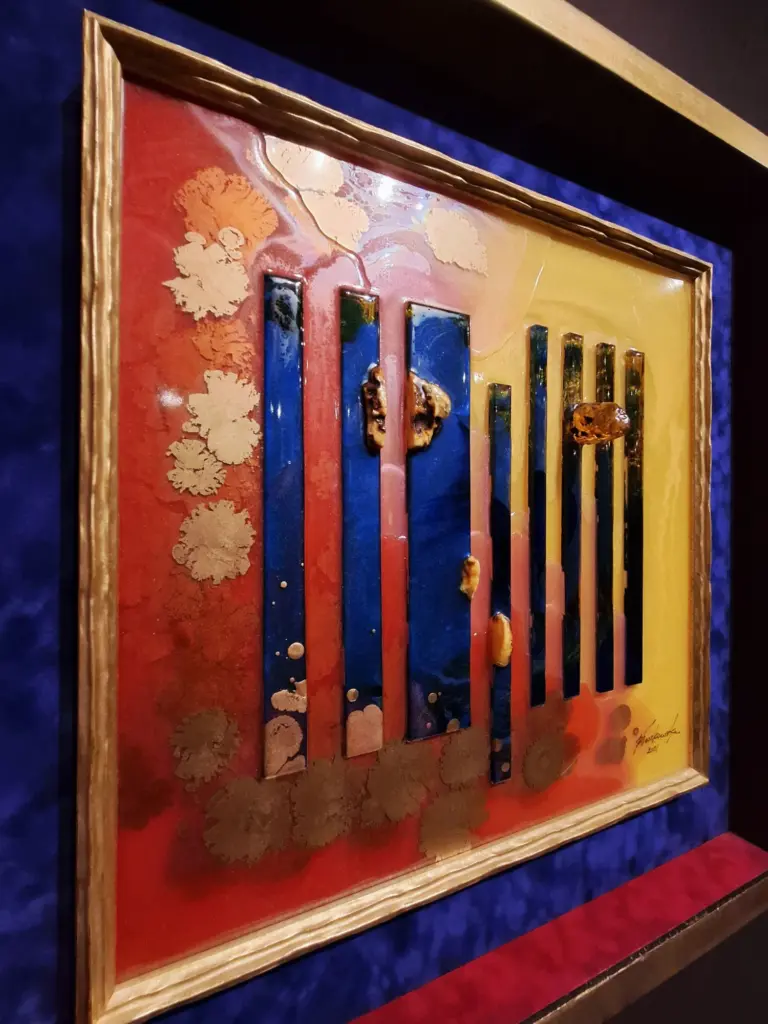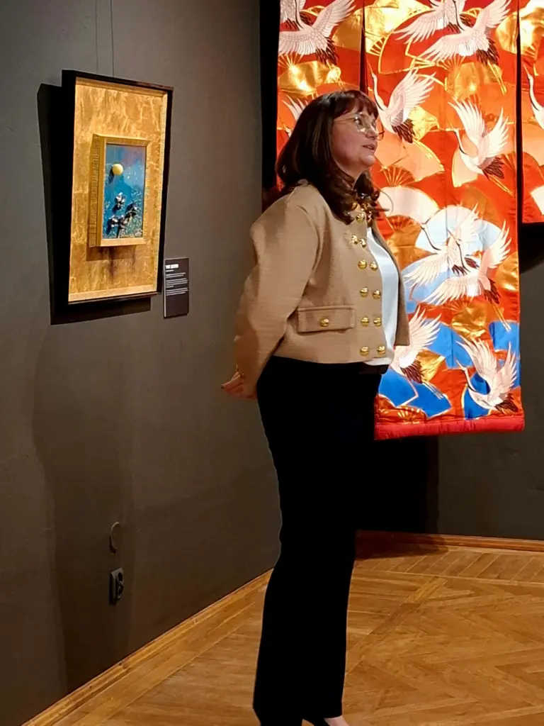 Szczególnym zaskoczeniem ekspozycji jest praca z wykorzystaniem kolorystyki kimona, w której artystka prowadzi dialog z ręcznie malowaną tkaniną, łącząc narrację kulturową z własnym językiem artystycznym. Wiele realizacji przyjmuje formę płaskorzeźb i obiektów trójwymiarowych, często wzbogaconych o 24-karatowe złoto i oprawionych w złocone portugalskie oraz włoskie ramy, co podkreśla luksusowy, a zarazem ponadczasowy charakter dzieł.