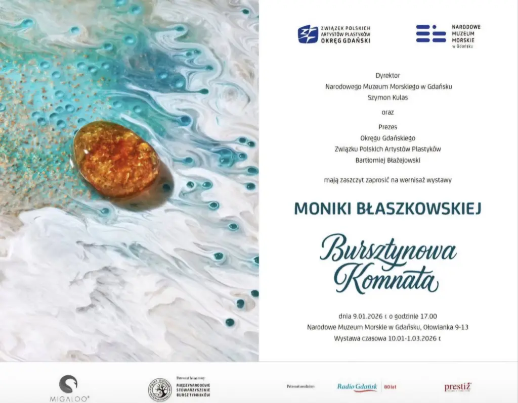 10 stycznia odbył się wernisaż wystawy zatytułowanej „Bursztynowa Komnata”. Ekspozycja prezentowana jest w głównej siedzibie Narodowego Muzeum Morskiego w Gdańsku na Ołowiance. To wyjątkowe wydarzenie artystyczne, które z powodzeniem łączy sztukę współczesną, design i naukę z refleksją nad kondycją współczesnego świata. Wystawa prezentuje najnowsze realizacje Moniki Błaszkowskiej — artystki, architektki i projektantki rozpoznawalnej zarówno w Polsce, jak i na arenie międzynarodowej.