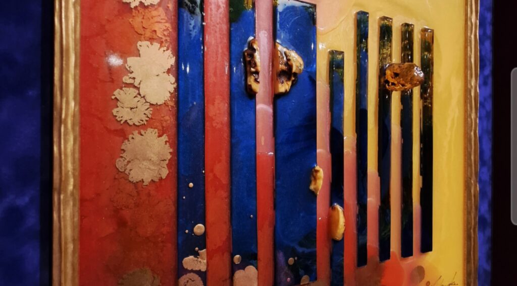 Szczególnym zaskoczeniem ekspozycji jest praca z wykorzystaniem kolorystyki kimona, w której artystka prowadzi dialog z ręcznie malowaną tkaniną, łącząc narrację kulturową z własnym językiem artystycznym. Wiele realizacji przyjmuje formę płaskorzeźb i obiektów trójwymiarowych, często wzbogaconych o 24-karatowe złoto i oprawionych w złocone portugalskie oraz włoskie ramy, co podkreśla luksusowy, a zarazem ponadczasowy charakter dzieł.