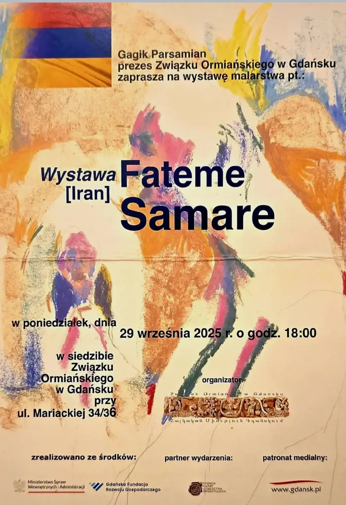 W Związku Ormiańskim w Gdańsku odbyła się wystawa prac Fateme Samare Hedayatzade. Od 2024 roku artystka jest mieszkanką naszego miasta. Pochodzi z Iranu – urodziła się w 1992 roku w Kermanie, stolicy prowincji o tej samej nazwie. Po ukończeniu studiów magisterskich z matematyki teoretycznej Fateme wraz z mężem podjęła decyzję o przeprowadzce do Paryża. We Francji kontynuowała naukę na Sorbonie, wybierając tym razem matematykę stosowaną. W 2021 roku zamieszkała w Wiedniu, gdzie kontynuowała naukę on-line. To właśnie tam rozpoczęła się jej przygoda ze sztuką. W rezultacie porzuciła matematykę, by całkowicie poświęcić się malarstwu i rysunkowi. W latach 2023–2025 pracowała pod kierunkiem wiedeńskiego artysty Hassama Samavatiana.